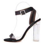 Celebrity inspired, chic and trendy! Block heel transparent shoes featuring a buckle strap closure.