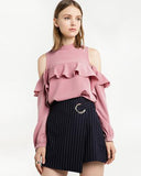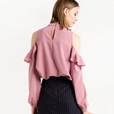 Give them the cold shoulder! This beautiful blouse features a ruffle bodice, off the shoulder look, and long full sleeves.