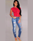 A very flattering pair of jeans! A must have for your wardrobe! This cute jeans feature a high-rise waist, a destroyed ripped style, a five-pocket construction, and a zip fly.