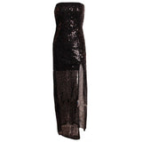 Simply glamorous! all heads will turn when you make an entrance to any room wearing this beautiful sequin creation. It features a floor-length flare skirt, strapless neck line and side slit style.