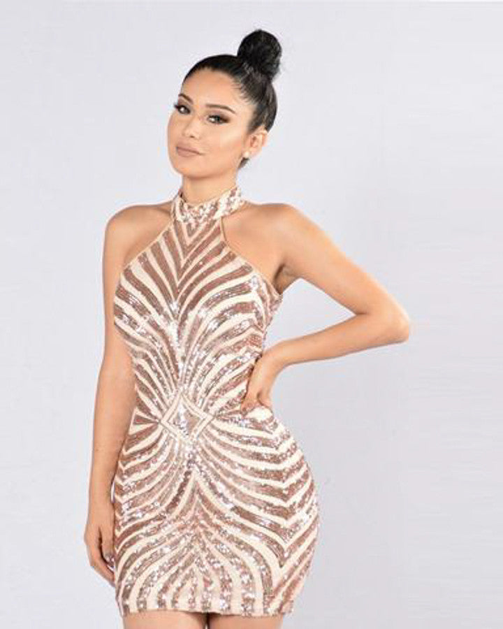 Add some sparkle to your life by slipping on this beautiful gold sequined dress. It features a high neck and sleeveless style.