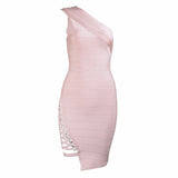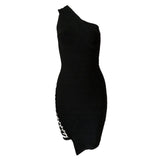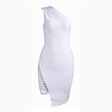 Chic and flawless! bodycon bandage dress accentuated with metal sequins on the side. This dress has all the elements to make your event unforgettable! It features a one shoulder silhouette with a sultry side slit, curve hugging silhouette with above the knee length.