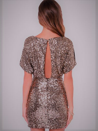 It's your time to shine! Gorgeous light reflecting sequins adorn this gorgeous dress. It features an above the knee hemline, an open back, and an O-neckline. Perfect for the holidays!