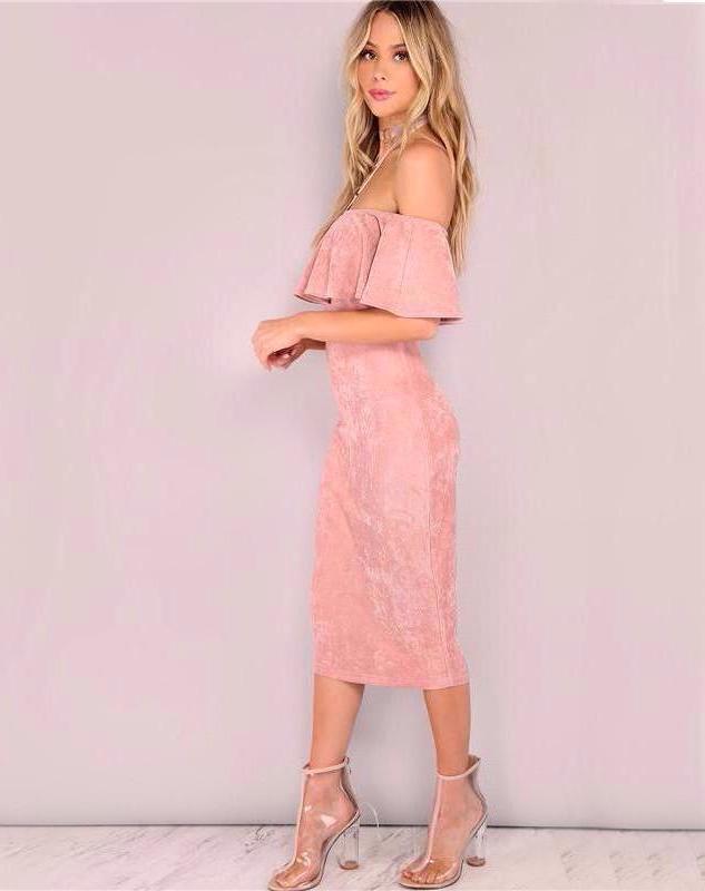 Let's all wear pink! A flawless bodycon dress featuring an off shoulder style with ruffles. Available only in pink color. Made with faux suede material. Looks amazing with heels.