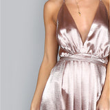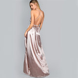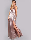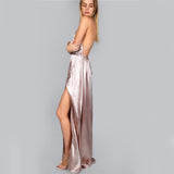 Classy and elegant and Oh so-chic. Get ready to turn heads in this silk-like stunning dress. It features a v-neckline, spaghetti straps, a long maxi hemline with a high side slit, and a criss-cross sash that ties at the back.
