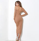 Get the trend! A below the knee-length ribbed knit dress. Featuring a slashed shoulders neckline. Available in sizes S, M, L in khaki, Burgundy, and Gray.