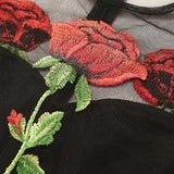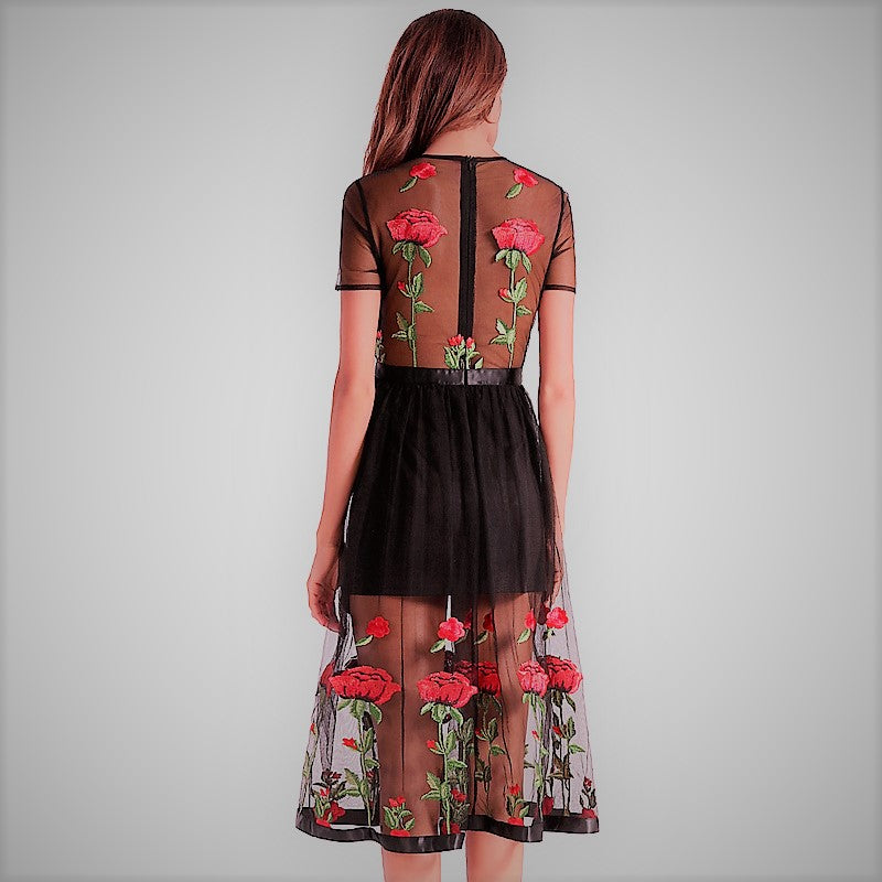 Look and feel your best! This dress is perfect for any occasion. It features a lovely array of roses embroidered throughout it's bodice and hemline. An A-Line style, short sleeves, and a sweetheart neckline underneath.