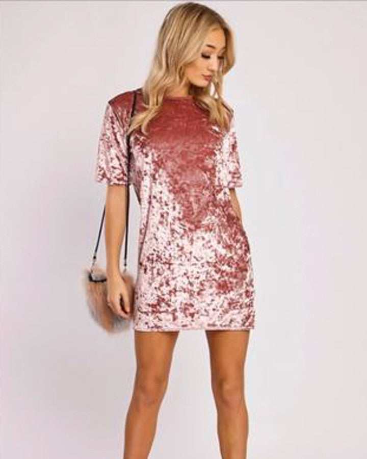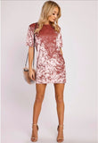 Feel glamorous wearing this lustrous velvet style. It features short sleeves, an O-neckline and a loose fitting look. You will look amazing when your accessorize your look with earrings, strap lace up heels or a pair of over the knee boots!