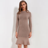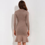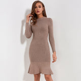 Sophisticated and trendy, the Sophia sweater dress is a lovely style which features ruffles at the hemline, a sheath silhouette, long sleeves, and an o-neckline.