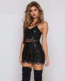 Shine bright in this two piece sequined dress. It features a sleeveless style with a v-neckline. Wear it with over the knee boots or strap heels, you can't go wrong either way!