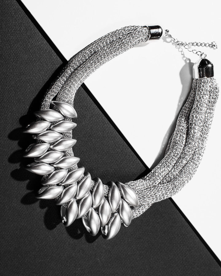 Make a statement! This power necklace is bold and beautiful! Two colors to choose from, featuring a knitted rope chain and geometric style detail.
