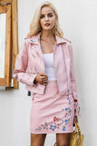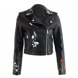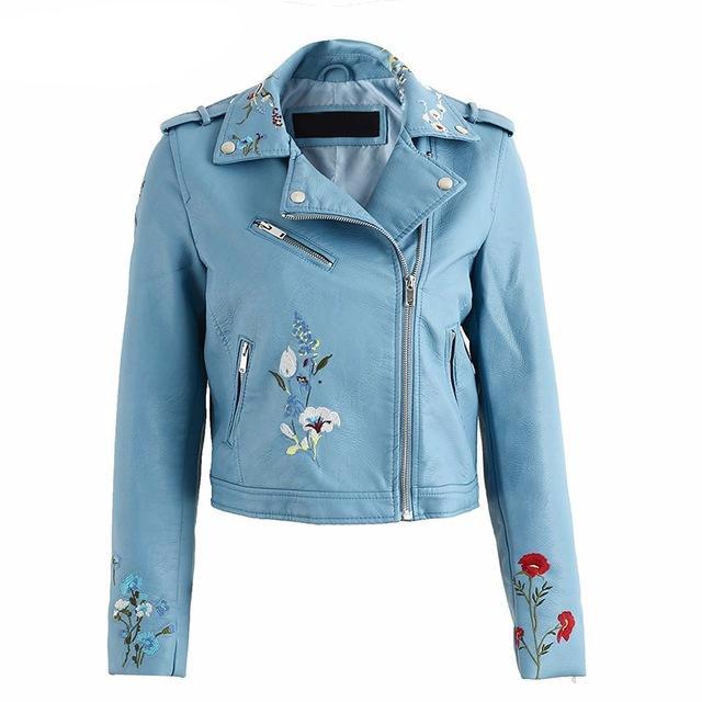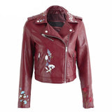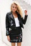Trendy and stylish! This leather jacket features a floral embroidered style, asymmetrical zip front, long zipper-cuff sleeves, button epaulettes, front mock zipper pockets, turn down collar, and interior lining. Matching skirt is also available.