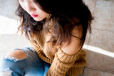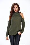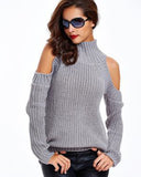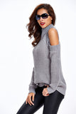 The cold shoulder look! It features a low turtle neckline, off the shoulder style, and long sleeves.