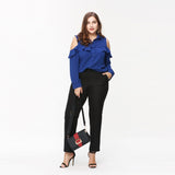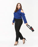 Get the look! This beautiful top features a cold shoulder style, ruffle bodice, and ruffle sleeves. Perfect for the office, wear with a skirt or pants.