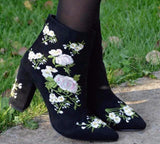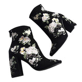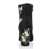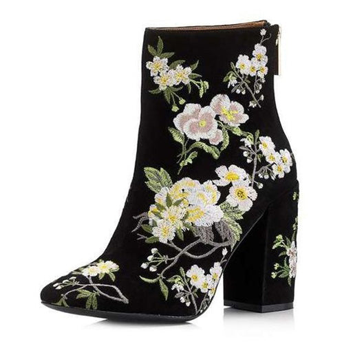 Walk in comfort and style! These boots feature a floral embroidered pattern throughout, pointed toes, squared heels and a zipper closure on the side.
