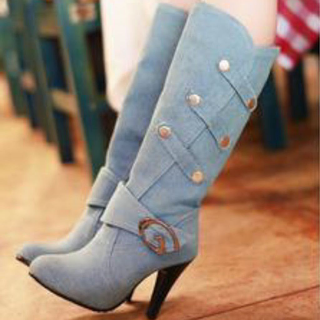 Beauty and style. Denim Knee High Boots.