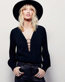 The look of elegance is yours in this beautiful blouse. It features a v-neck line, full length sleeves, and a beautiful metal geometric detail at front.