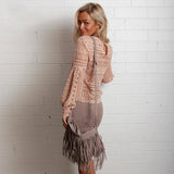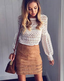 Flawlessly Chic, get the look! This top is a must have for this spring and summer. It features a lantern sleeve, an O-neckline, and a beautil lace pattern.
