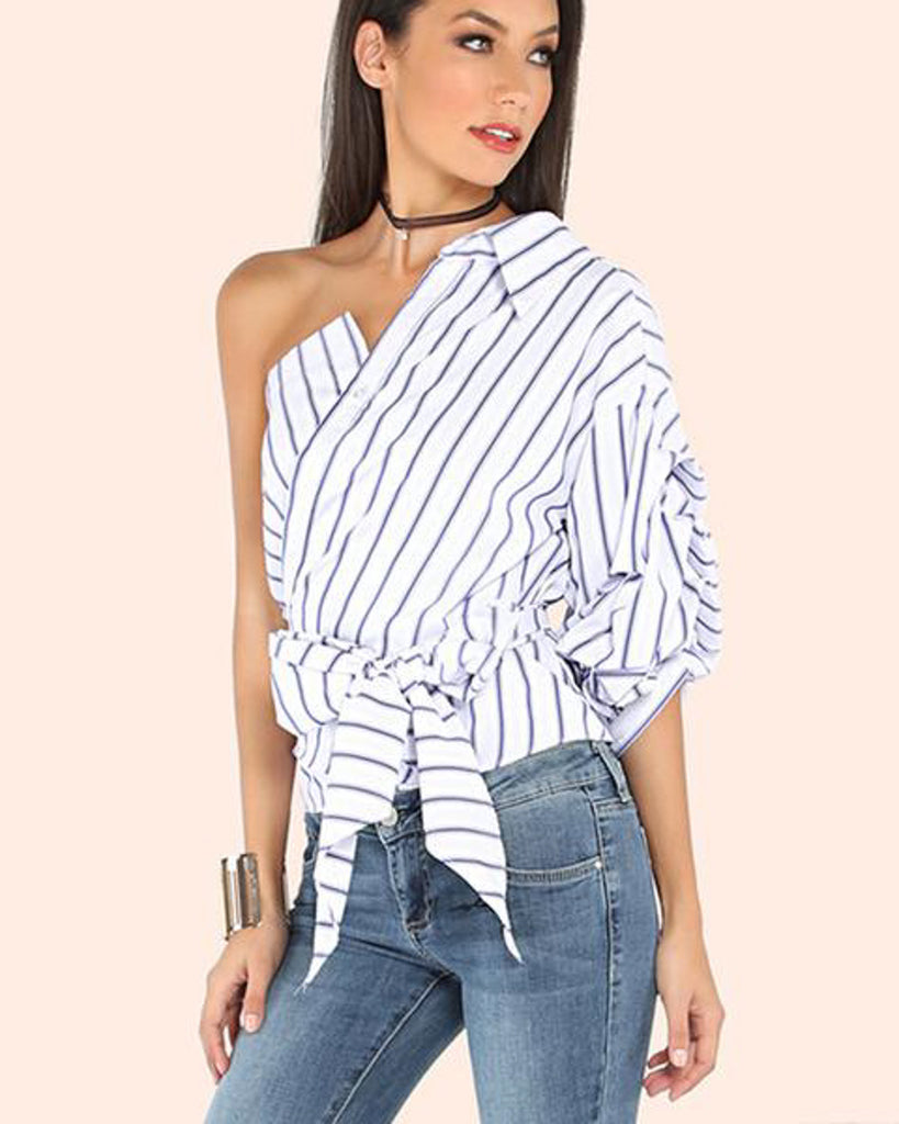 Perfect for spring and summer! This beautifully crafted top is a must have for your closet. It features a one shoulder style, a puff sleeve, and a beautiful sash. Looks amazing with jeans or leggings!
