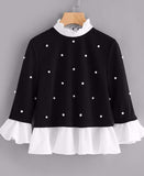 Ruffles and Pearls. A look so feminine, how can you go wrong? This cute blouse features a ruffled O-neckline, three quarter flared sleeves with ruffles at end, and is embellished with pearls throughout.
