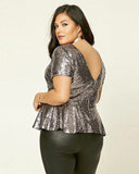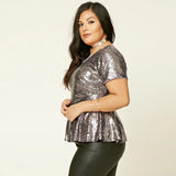 Outshine the rest! with this lustrous sequin top! It features a peplum style, O-neckline, and short sleeves. Looks great with a choker!